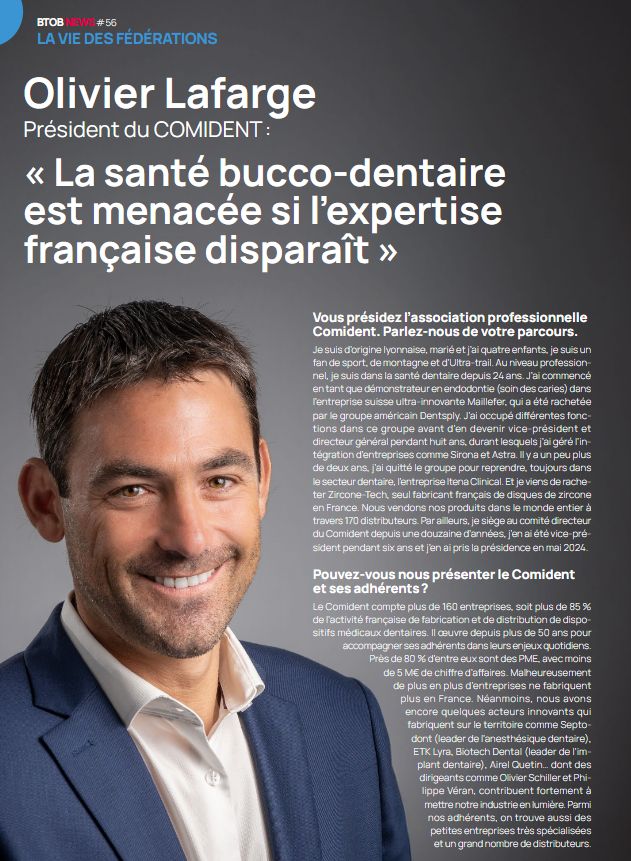 Dans le dernier numéro de B2B News, magazine de la CGF, Olivier Lafarge, président du COMIDENT, partage son analyse des défis majeurs de la filière dentaire et des enjeux auxquels les entreprises font aujourd’hui face.